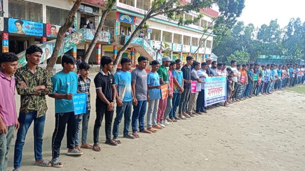রৌমারীতে খেলার মাঠ দখল করে ভবন আশ্রয়ন প্রকল্পের ভবন নির্মাণের চেষ্টা প্রতিবাদে মানববন্ধন