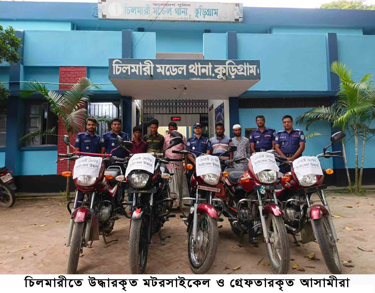 কুড়িগ্রামের চিলমারীর কড়াই বরিশাল এলাকায় অভিযান চালিয়ে ৫টি চোরাই মটরসাইকেলসহ ৫জনকে গ্রেফতার করেছে চিলমারী মডেল থানা পুলিশ। গত শুক্রবার গভীর রাতে উপজেলার চিলমারী ইউনিয়নের কড়াই বরিশাল এলাকায় চিলমারী মডেল থানার অফিসার ইনচার্জ আশরাফুল ইসলামের নেতৃত্বে গোপন সংবাদের ভিত্তিতে অভিযান পরিচালনা করে ৫টি চোরাই মটরসাইকেল উদ্ধার করা হয়। ৩টি বাজাজ সিটি-১০০, ১টি প্লাটিনা ও ১টি পালসার মটরসাইকেলসহ চোর সন্দেহে ৫জন কে গ্রেফতার করে আসামীদের চিলমারী থানায় নিয়ে আসা হয়। আসামীরা হলেন মিলন (২৬) পিতা- জাহাঙ্গীর, হান্নান (৩২) পিতা- মৃত আব্দুল জব্বার, সাদাকাত হোসেন (৩৫) পিতা- জেলহক, নুরুল হুদা (৩৫) পিতা- মৃত এমদাদুল হক এরা কড়াইবরিশাল এলাকার বাসিন্দা এবং রুবেল (২৭) পিং- জাহানুর রহমান, হক বাজার, নয়াটারী, হারাগাছ, কাউনিয়া এলাকার। চিলমারী থানার অফিসার ইনচার্জ আশরাফুল ইসলাম জানান, মাওলানা ভাসানী সেতু উদ্বোধনের পর হতে মটরসাইকেল চুরিসহ অন্যান্য অপরাধ প্রবণতা বৃদ্ধি পাওয়ায় পুলিশের বিশেষ অভিযানে উপজেলার পাম্পের মোড় হতে রুবেল কে মটরসাইকেল চোর সন্দেহে গ্রেফতারের পর তার তথ্যমতে বিক্রিত চোরাই মটরসাইকেল উদ্ধারে এ অভিযান চালানো হয়েছে। এ ব্যাপারে চিলমারী মডেল থানায় একটি মামলা দায়ের হয়েছে যার নম্বর ০৪ তারিখ: ২৭/০৯/২০২৫।